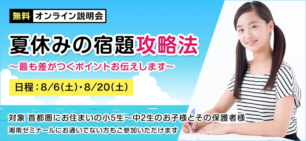 【総合進学コース】8/6(土)開催!無料オンライン説明会「夏休みの宿題攻略法~最も差がつくポイントお伝えします~」のお申し込み受付中!|湘南ゼミナール