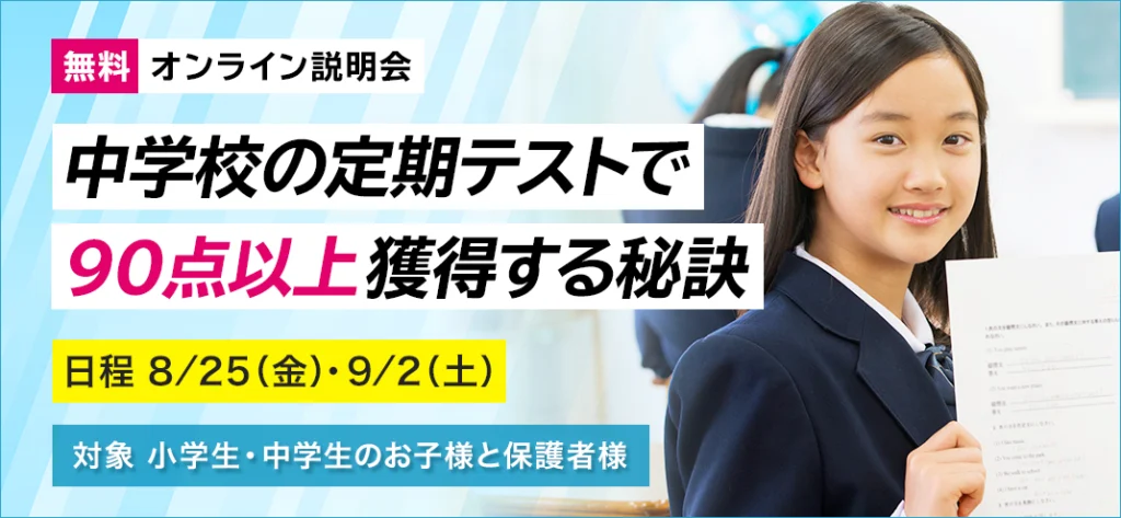 【総合進学コース】無料オンライン説明会「中学校の定期テストで90点以上獲得する秘訣」のお申し込みを受付中!