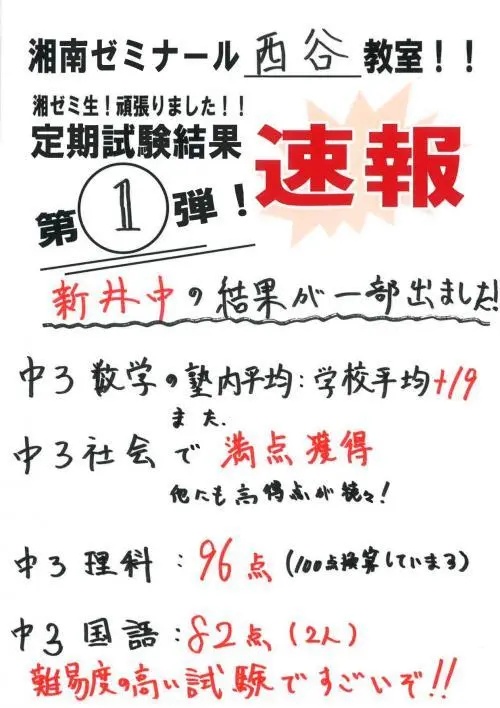 新井中前期中間試験結果第1弾!