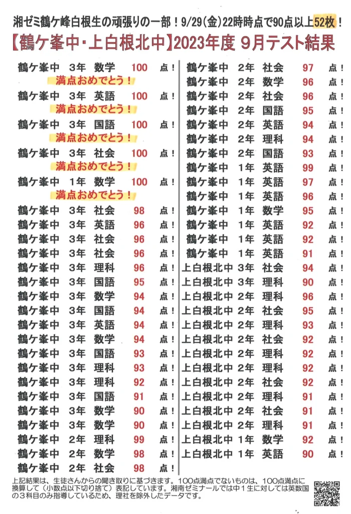 【鶴ヶ峯中・上白根北中】9月定期テスト結果速報!
