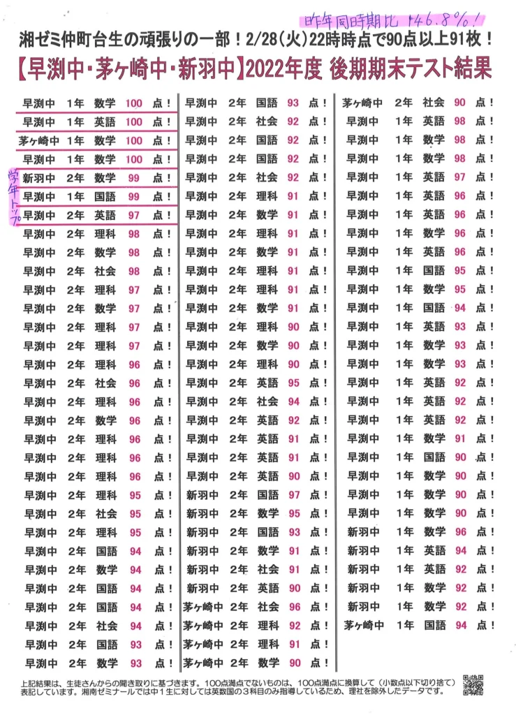 【早渕中・茅ヶ崎中・新羽中】2022年度後期期末テスト結果!(2/28更新)