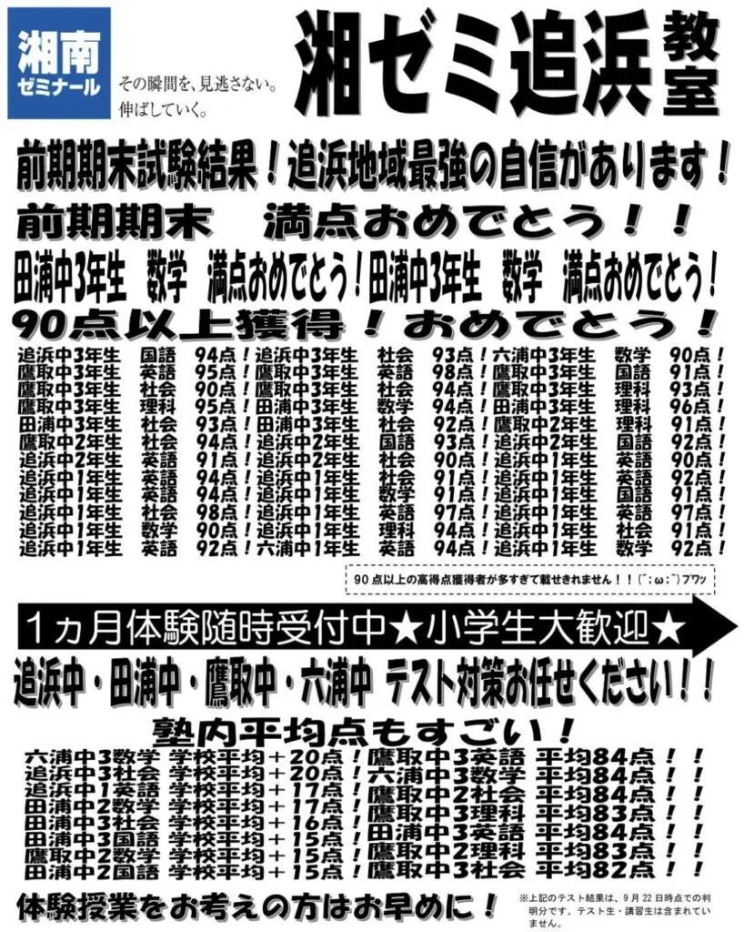 湘南ゼミナール追浜教室 前期期末テスト結果 第1弾!